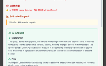 يستخدم الملحق تقنية الذكاء الاصطناعي المتقدمة لتقديم تقييمات مفصلة للمخاطر بلغة سهلة الفهم، مما يجعله متاحًا حتى لأولئك الأقل دراية بتعقيدات SQL. يتكامل بسلاسة في بيئة pgAdmin، دون الحاجة إلى تكوين، مما يسمح بتنفيذ الاستعلامات الآمنة دون انقطاع. مثالي لأي شخص يدير قواعد بيانات الإنتاج أو يقوم بعمليات معقدة، يوفر PgAdmin Query Guardian راحة البال من خلال منع الكوارث العرضية في قواعد البيانات.